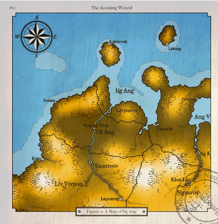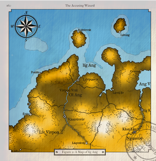 For the past month or so, I've continued to modify and extend Martin's map generator. His maps reminded me of something you might see inside the front cover of an old fantasy paperback, so I made them look more like an old book page. I added color, and different ways to display the maps.