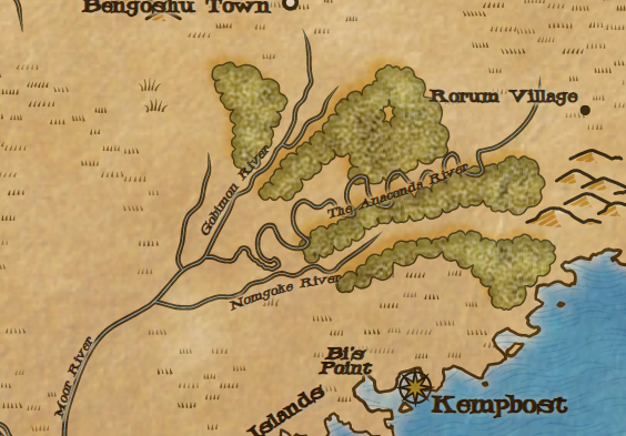 In the map above, the river name was hard-coded. I need to be able to generate a variety of names for meanders. In this case, I generate two kinds of names. One kind is variants of “The Meander" using different synonyms for meander, both obvious ones like Rambles and archaic ones like “Cringle-Crangles." The other kind is variants on “The Snake River" with different synonyms for snakes and other snake-like things.